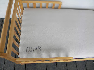 After I got the covers done, I thought I would be really clever and put MOLLY on one and DIESEL and HANNAH on the other with stencils. I started Molly's first and because I was so worried about spacing and lining them up straight, I put MOO instead of MOL! Then I was stuck and didn't know what to do so I told my daughter about my mistake and she laughed (of course) and told me to just put OINK on the other since I live on a farm and people will think it was supposed to be like that.